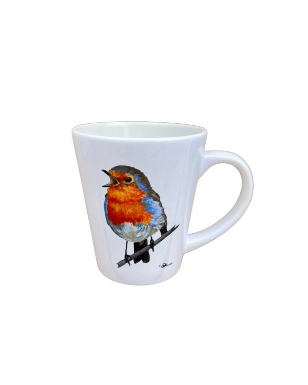 Latte mok met Roodborstje (handgeschilderd). Een stijlvol en persoonlijk cadeau voor liefhebbers van natuur, kunst en design. Uniek vakmanschap met oog voor detail, ideaal voor dagelijks gebruik of als attent geschenk.